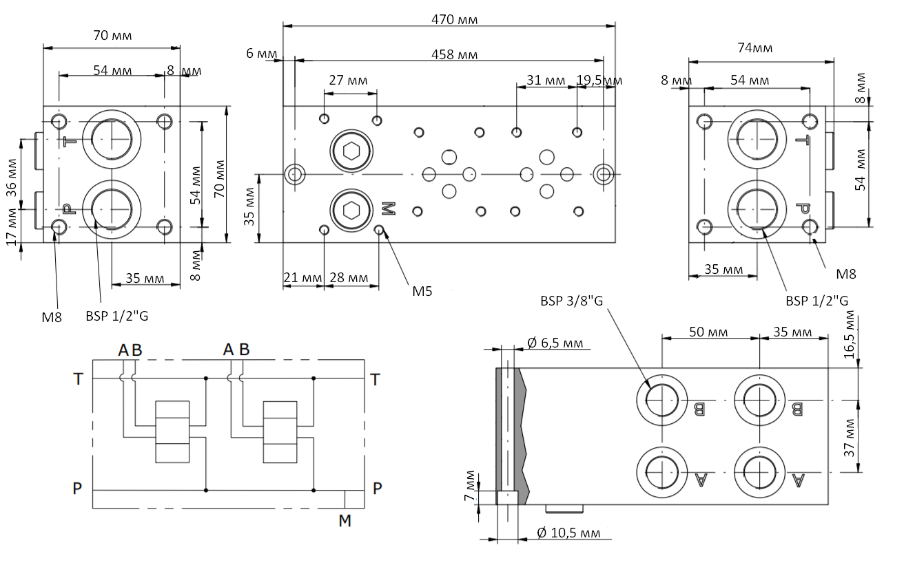 Гідравлічна монтажна плита італійського виробника OLEODINAMICA 2MP EA06-21-38-08-1-4-H на 8 монтажних місць для гідророзподільників. Вона використовується в якості допоміжного приєднуючого компоненту для монтажу і з'єднання в одному місці гідророзподільників і клапанів різного гідравлічного обладнання.
