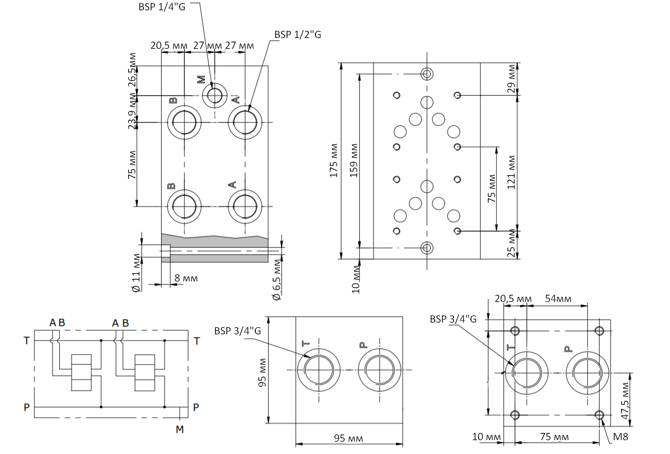Гідравлічна монтажна плита італійського виробника OLEODINAMICA 2MP EA10-06-12-02-1-3-H на 2 монтажних місця для гідророзподільників. Вона використовується в якості допоміжного приєднуючого компоненту для монтажу і з'єднання в одному місці гідророзподільників і клапанів різного гідравлічного обладнання.