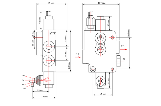 В корпусі виконано три отвори під болт М8 для кріплення розподільника. Приєднувальні порти різьбові – порт тиску та робочі порти А та В – G1/2”, а порт зливу масла в бак – G3/4”.