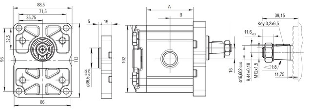 Приєднувальний фланець та вал – європейський. Діаметр замка фланця 36,5 мм. Кріплення фланця виконано на 4 отвори діаметром 9 мм, міжосьова відстань між отворами кріплення 71,5 мм. Вал – 1:8 з сегментною шпонкою 3,2х6,5, гайка М12х1,5. Порти насосу різьбові: всмоктувальний 3/4" BSP, порт тиску 1/2” BSP.